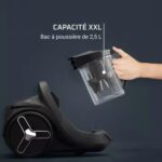 - Technologie d’aspiration : Cyclonique : utilise la force centrifuge pour séparer les poussières de l’air et les coller sur les parois pour retomber dans le bac. Elle offre une force d’aspiration constante pendant toute la durée du nettoyage