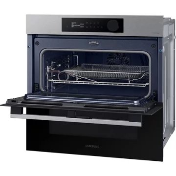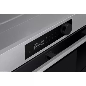 Le four Samsung NV7B5755SAS arbore un design qui mélange subtilement la sobriété et l’élégance du verre noir (sur les portes des deux cavités) avec un inox épuré (sur la partie supérieure et la poignée). Au-delà de ses qualités esthétiques, ce four Samsung dispose d’une interface intuitive et discrète composée d’un écran mono LCD 2,25″ et d’une molette rotative.