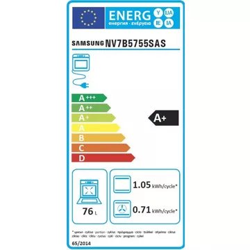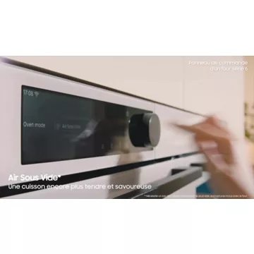 La technologie Dual Cook Flex™ du four Samsung NV7B5755SAS divise l’intérieur en 2 cavités indépendantes, accessibles par un système d’ouverture à deux portes. Vous pourrez alors cuire deux plats simultanément avec des températures et des temps de cuisson différents (mode Twin Convection™). Pour utiliser le grand espace 76 litres de ce four pyrolyse et cuisiner des plats volumineux, retirez tout simplement le séparateur de cavité. En plus, il contient un rail télescopique qui vous permet de charger, badigeonner, tourner, assaisonner et décharger vos plats sans risquer de vous brûler. Sa consommation énergétique ? Ce four Samsung présente une efficacité A+.