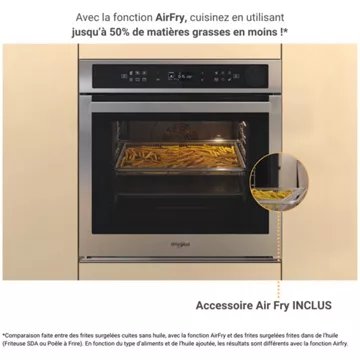 La fonction Air Fry du four pyro WHIRLPOOL AKZ9S8271IX SteamSense révolutionne votre manière de cuisiner en vous permettant de préparer des plats croustillants avec 50 % de matière grasse en moins, et sans utiliser de papier cuisson. La chaleur pulsée assure une répartition uniforme de la chaleur.