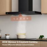 - Arrêt temporisé : oui, permet de programmer une durée de fonctionnement après la cuisson. Une fois cette durée écoulée, la hotte s’éteint automatiquement, offrant ainsi un moyen pratique d’économiser de l’énergie et de prolonger la purification de l’air après la cuisson.