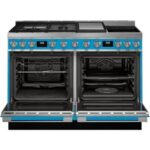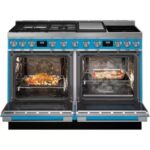 CENTRE DE CUISSON 120 CM, DOUBLE FOURS CHALEUR TOURNANTE DONT UN AVEC NETTOYAGE PYROLYSE ET UN AVEC NETTOYAGE VAPOR CLEAN, 2 FOYERS INDUCTION AVEC MULTIZONE, 3 FOYERS GAZ, 1 TEPPAN YAKI, SONDE A VIANDE, BLEU TURQUOISE