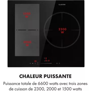 Cuisson flexible : trois zones de cuisson de 2300 W, 2000 W et 1500 W, zone Flex de