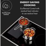 - Sécurités : arrêt automatique, anti surchauffe, verrouillage du clavier, témoin de chaleur résiduelle, détection d’absence de récipient, témoin de mise sous tension