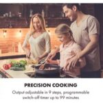 - Sécurités : arrêt automatique, anti surchauffe, verrouillage du clavier, témoin de chaleur résiduelle, détection d’absence de récipient, témoin de mise sous tension